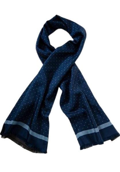 Esarfa dubla, matase, bleumarin, cu puncte model delicat, materiale de inalta calitate. Daca iti doresti un produs de calitate si manopera perfecta atunci alege acest model perfect pentru tinuta ta.