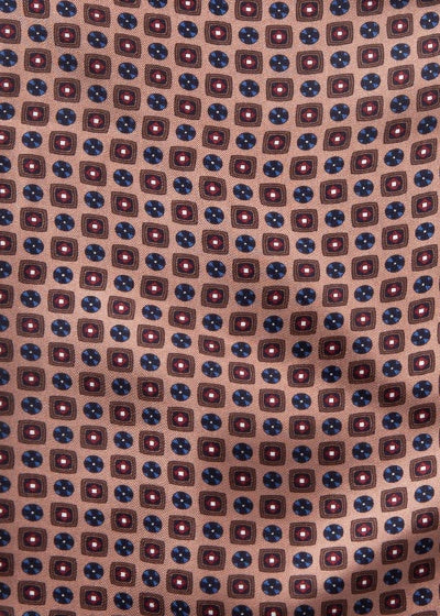 Această eșarfă subtilă de cravată a mărcii ce evocă o aură de finețe stilată. Există un model ornamental elegant pe fundalul bej opalescent.